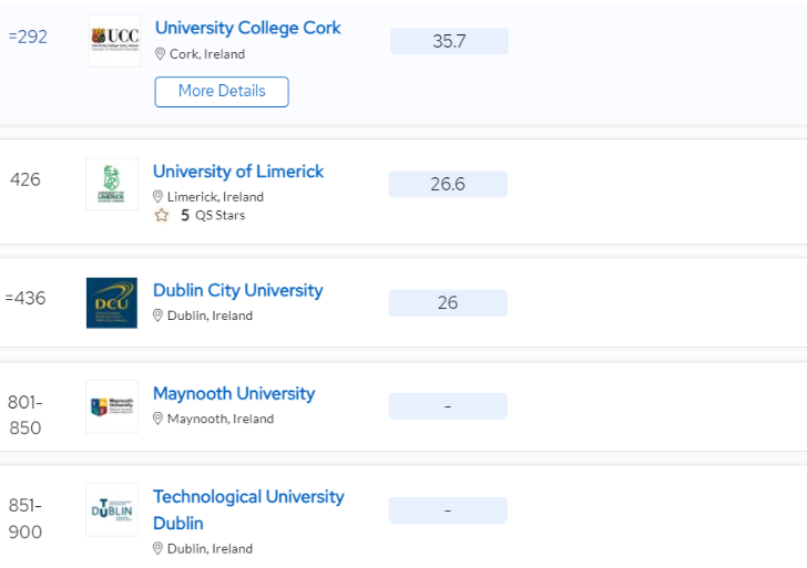 這個(gè)排名包括了七所傳統(tǒng)的愛(ài)爾蘭大學(xué)以及都柏林科技大學(xué)(TU Dublin),其中八所大學(xué)中有七所提升了自己的排名。都柏林大學(xué)學(xué)院(University College Dublin,UCD)是排名第二的愛(ài)爾蘭大學(xué),該校從第181位升至第171位。高威大學(xué)(University of Galway)排名小幅下降,位列第289位,但在愛(ài)爾蘭仍然位列第三。