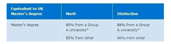 相當(dāng)于英國“榮譽(yù)學(xué)士”2:1:85% 或 GPA3.5(來自A類大學(xué))